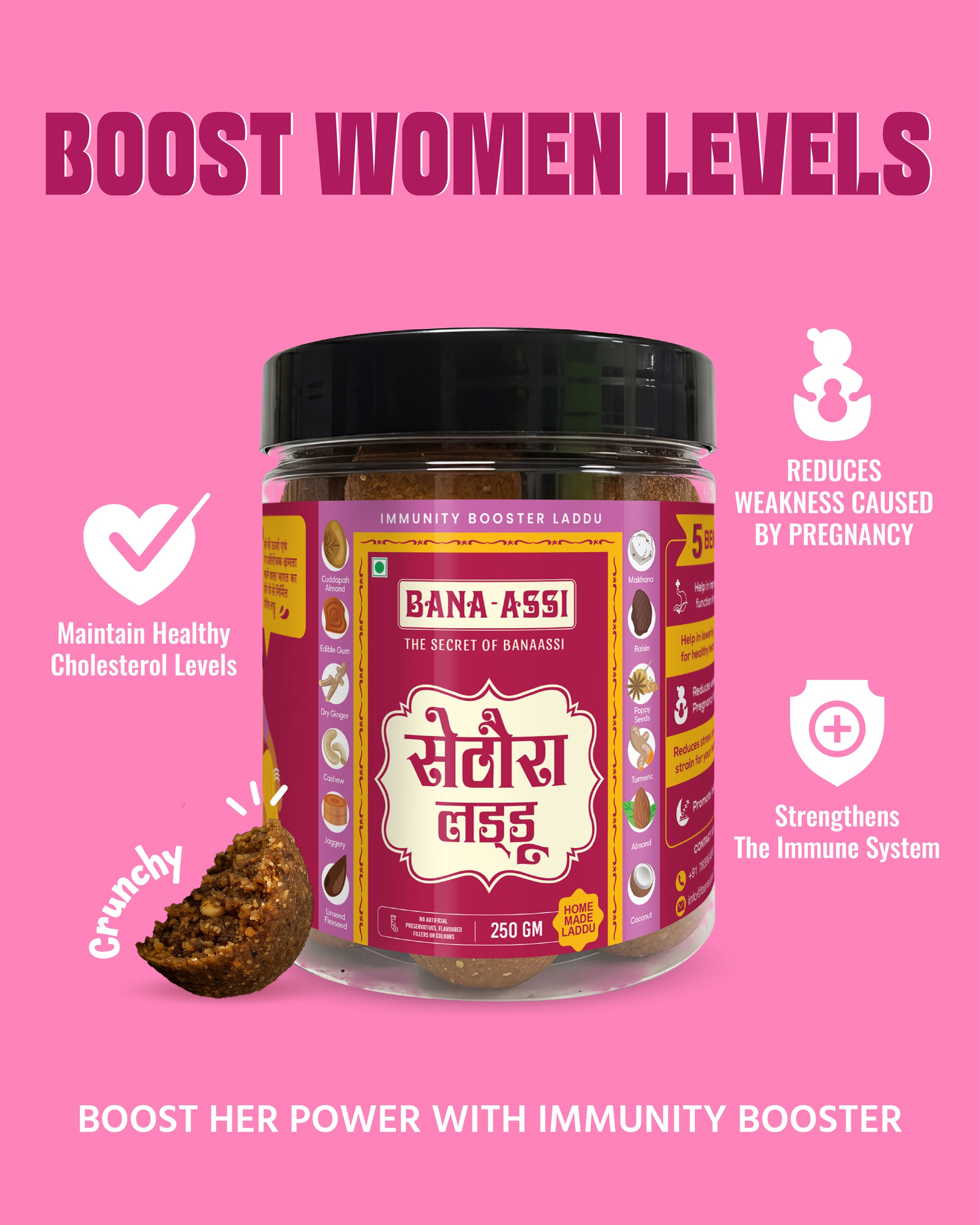 Sethura Laddu by BANA-ASSI is a powerful blend of 10+ premium dry fruits, seeds, and ancient Ayurvedic herbs designed especially for Women’s Wellness. Whether you are a new mom, a working professional, or a fitness enthusiast, Setura Laddu supports your Immunity, Energy, and Hormonal balance — all while being Delicious and Natural.